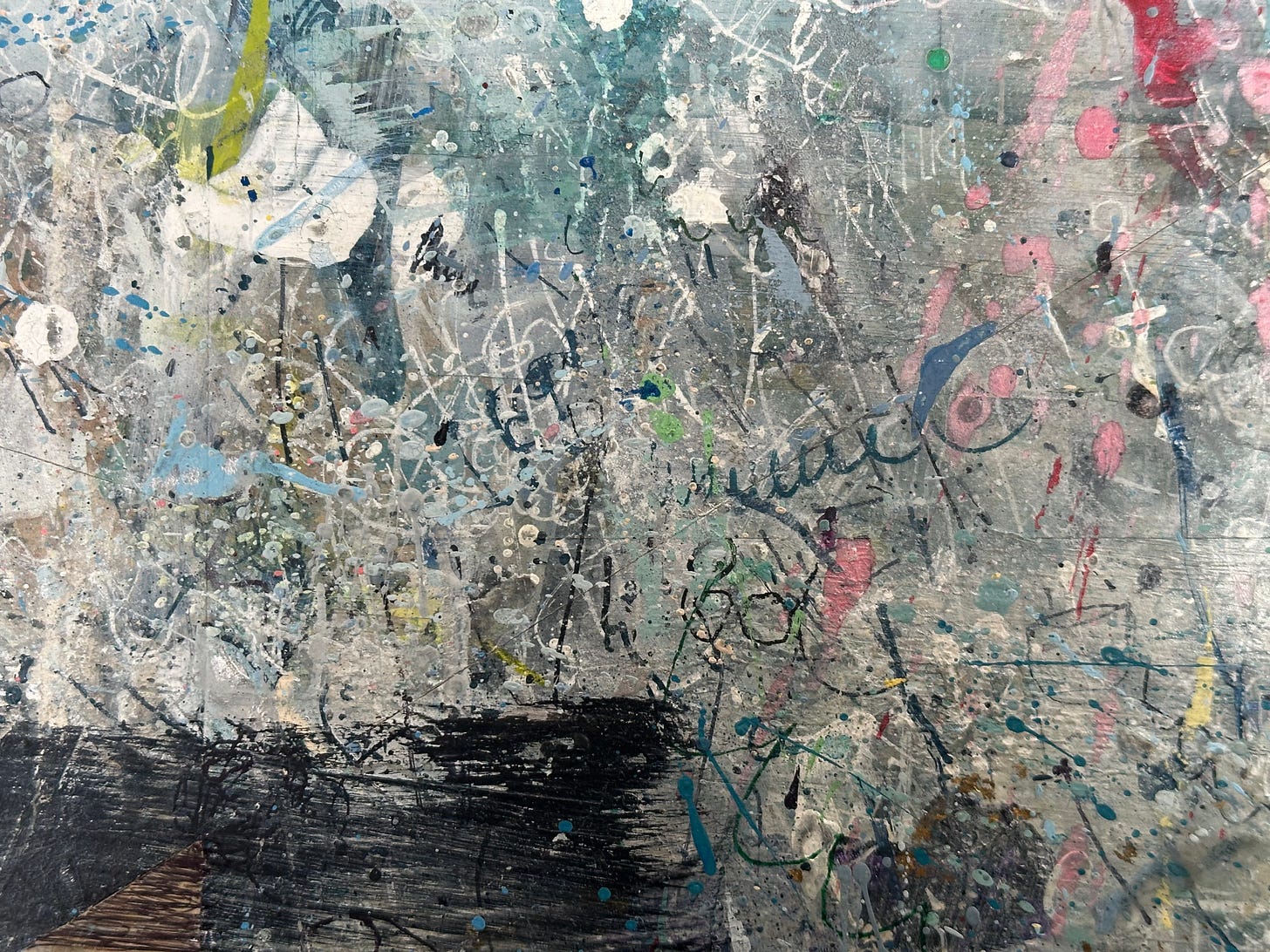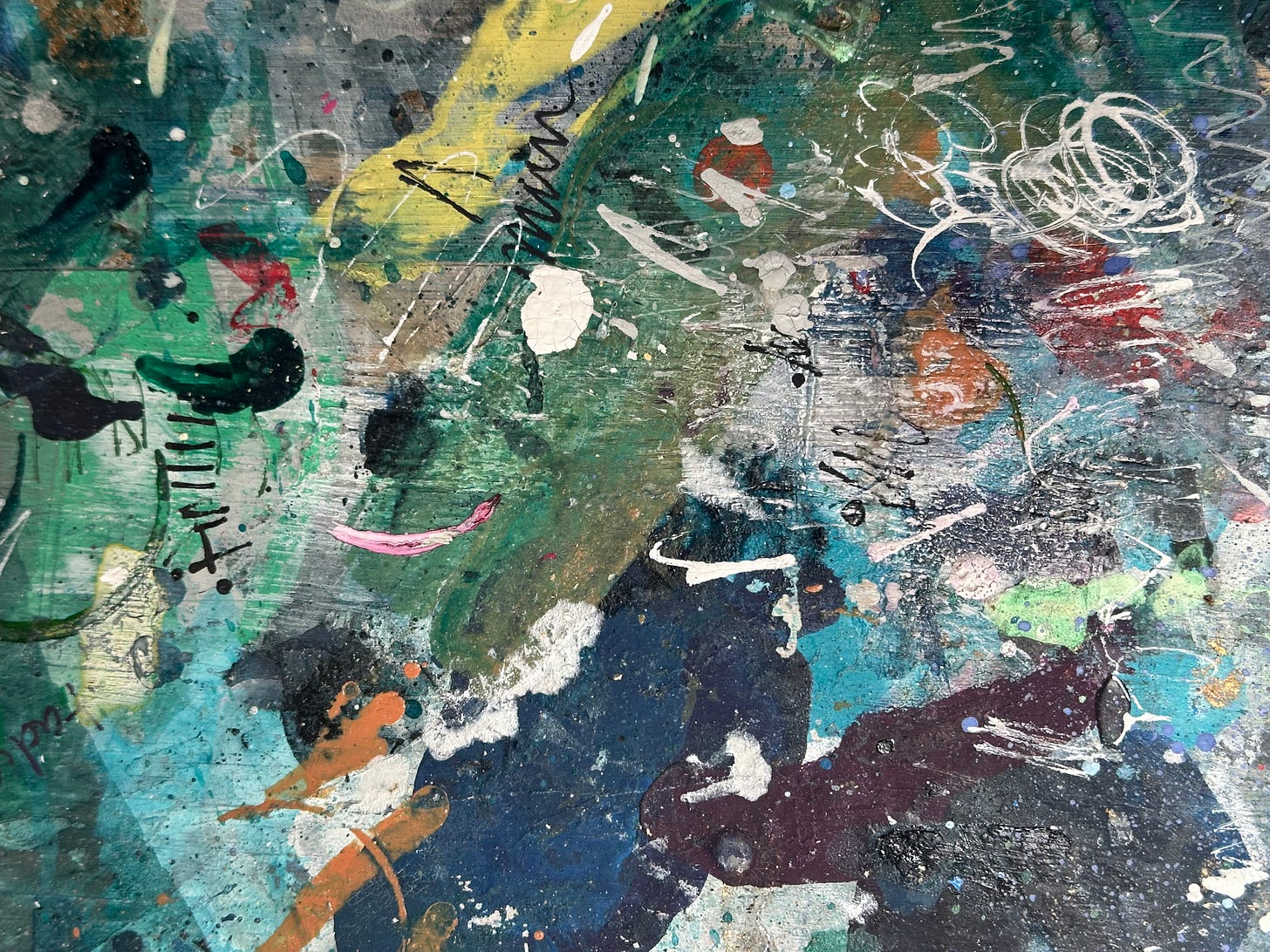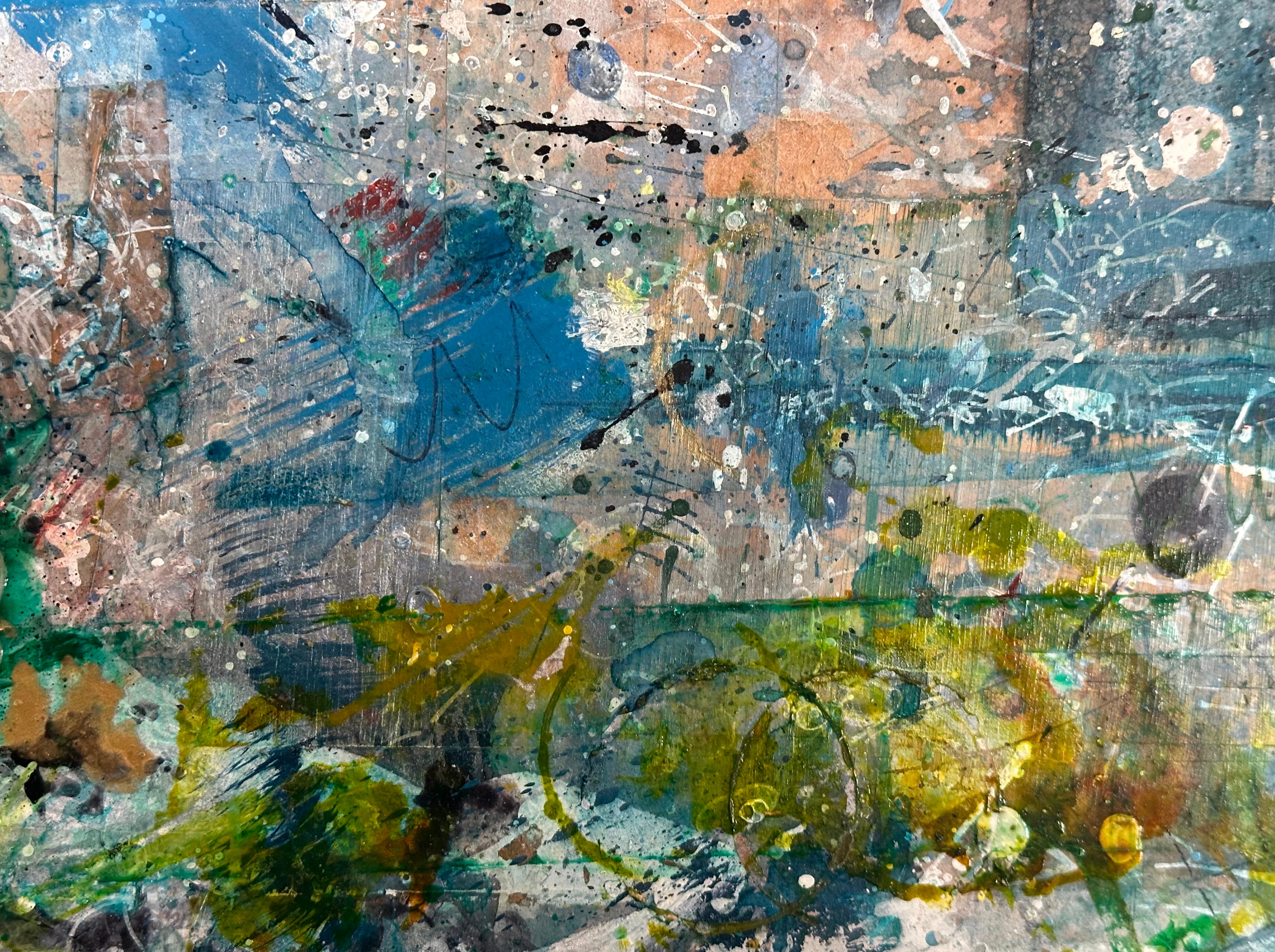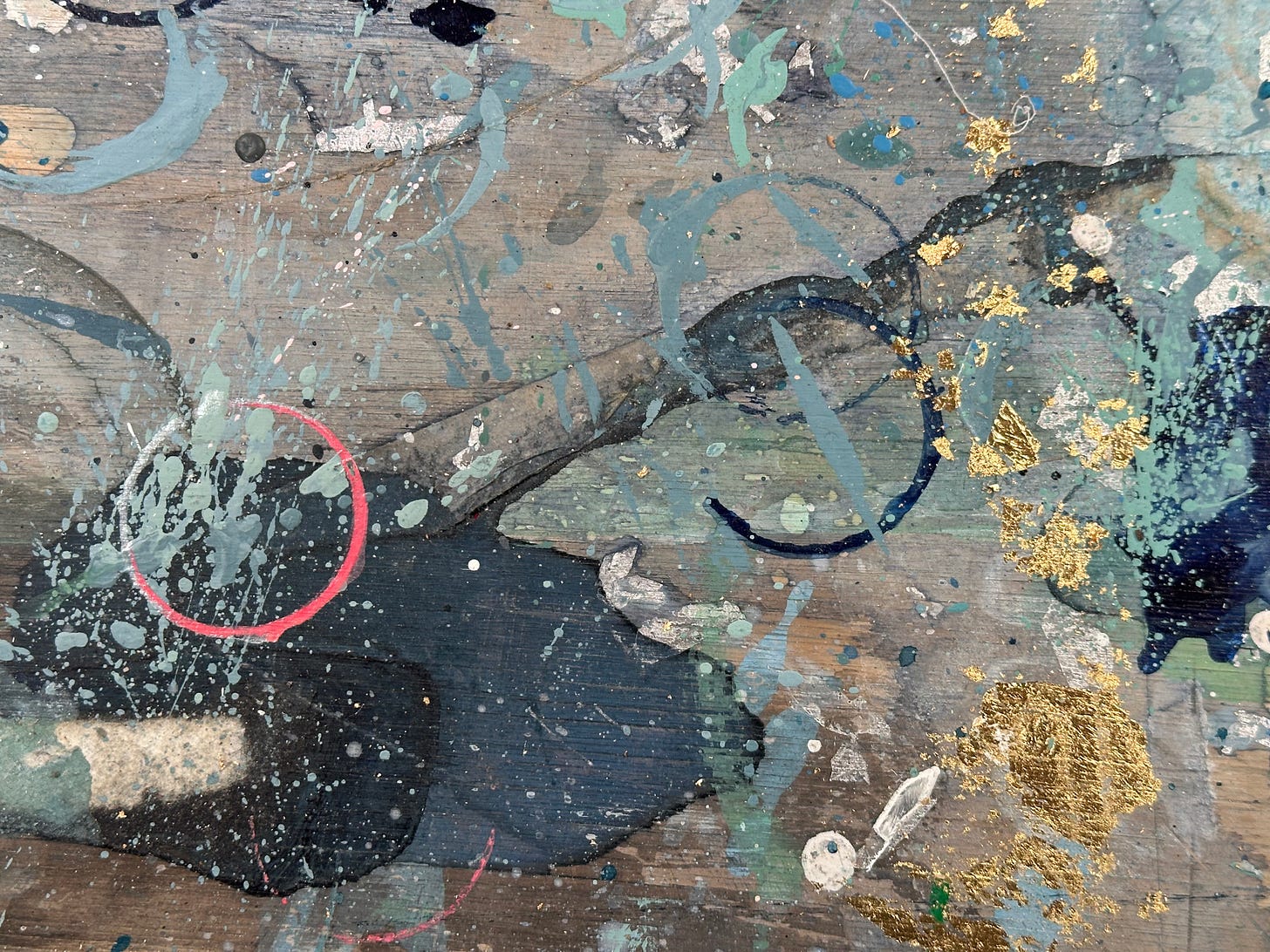 While my brain’s engine idles, I look at the worktop in my studio and absent mindedly admire its patina. Layers and layers of paint and pen marks, a record of the last ten years of painting. I see spots of certain colours and remember which painting they came from, scraps of gold leaf that got stuck, spillages and smears and tests and nib unblockings and ring marks. Layer upon layer.