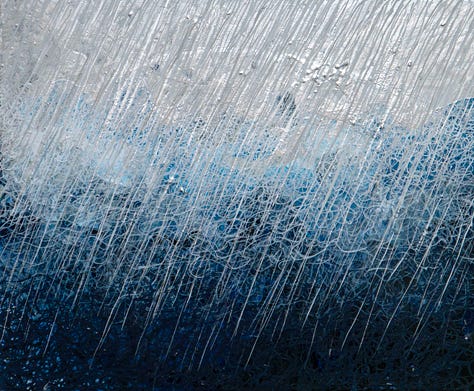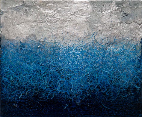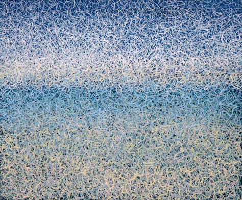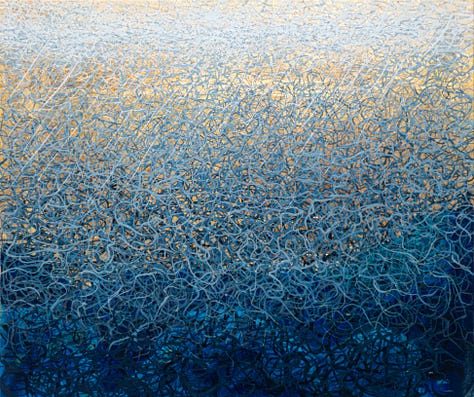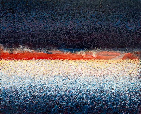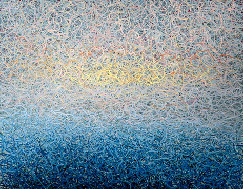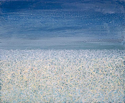 I’m trying to respond to a kind of energy in the natural world around me, a frequency that might be the oscillations of light, or the waves on the sea, or the grass shivering in the wind, or my own fizzing nervous system. Because these paintings are as much abut the act of perceiving as what is perceived: the faint floaters that drift in my eyeball, the jitters of attention-distraction, the anxiety that intercuts the delight of being outside in the wind and light.